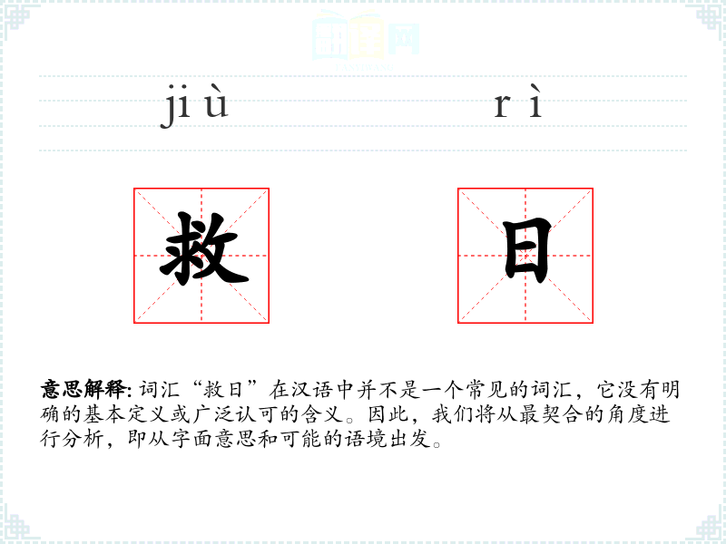 词汇“救日”在汉语中并不是一个常见的词汇,它没有明确的基本定义或广泛认可的含义。因此,我们将从最契合的角度进行分析,即从字面意思和可能的语境出发。