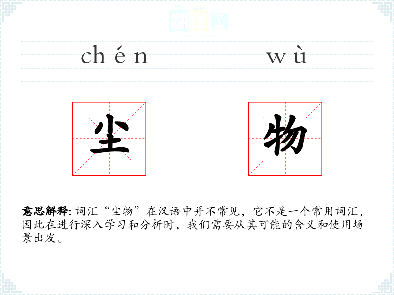 词汇“尘物”在汉语中并不常见,它不是一个常用词汇,因此在进行深入学*和分析时,我们需要从其可能的含义和使用场景出发。