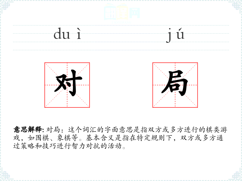 对局:这个词汇的字面意思是指双方或多方进行的棋类游戏,如围棋、象棋等。基本含义是指在特定规则下,双方或多方通过策略和技巧进行智力对抗的活动。