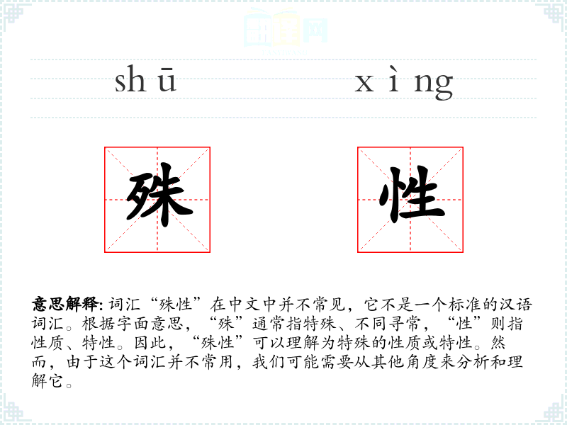 由于“殊性”不是一个常用词汇,它在不同语境下的使用可能非常有限。在专业领域,如生物学或心理学,可能会用来描述某种生物或心理现象的特殊性质。