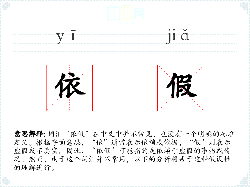 词汇“依假”在中文中并不常见,也没有一个明确的标准定义。根据字面意思,“依”通常表示依赖或依据,“假”则表示虚假或不真实。因此,“依假”可能指的是依赖于虚假的事物或情况。然而,由于这个词汇并不常用,以下的分析将基于这种假设性的理解进行。