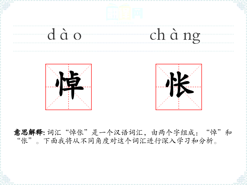 “悼”字最早见于《说文解字》,原意为哀悼死者。“怅”字则源于古代汉语,表示心情不快。这两个字结合在一起,形成了描述深切哀伤和忧郁情绪的词汇。