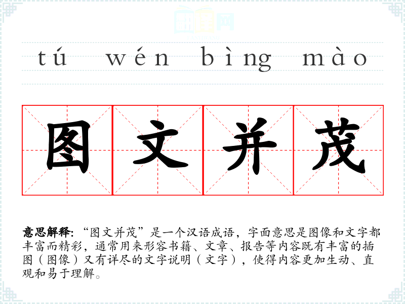 “图文并茂”是一个汉语成语,字面意思是图像和文字都丰富而精彩,通常用来形容书籍、文章、报告等内容既有丰富的插图(图像)又有详尽的文字说明(文字),使得内容更加生动、直观和易于理解。