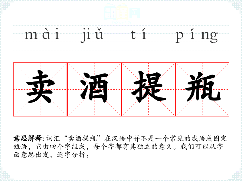 词汇“卖酒提瓶”在汉语中并不是一个常见的成语或固定短语,它由四个字组成,每个字都有其独立的意义。我们可以从字面意思出发,逐字分析: