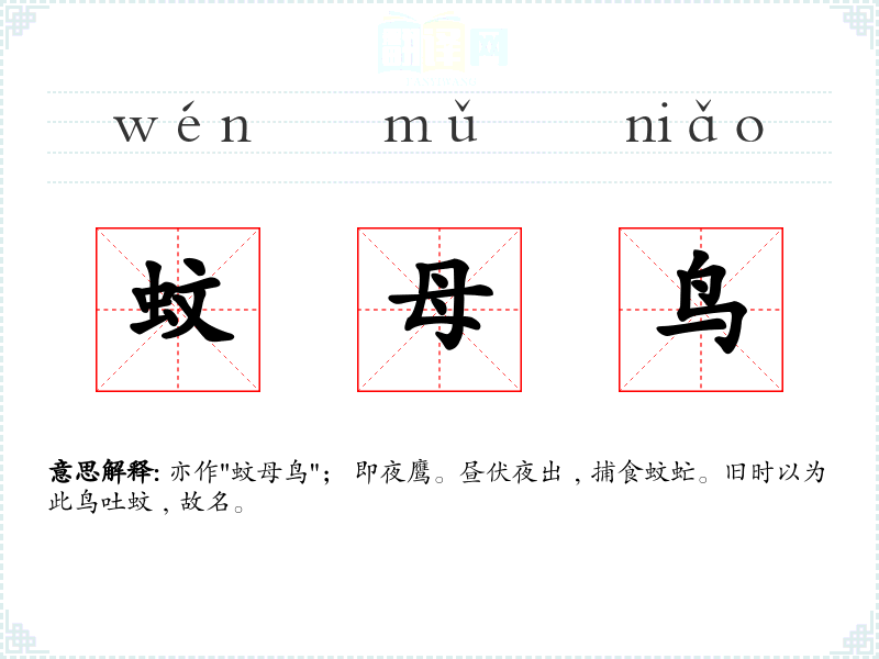 亦作"蚊母鸟"; 即夜鹰。昼伏夜出﹐捕食蚊虻。旧时以为此鸟吐蚊﹐故名。