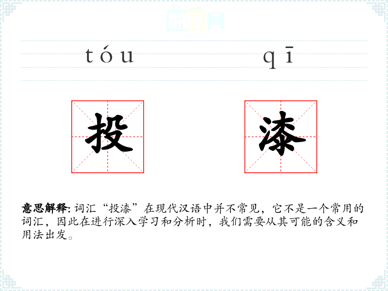 词汇“投漆”在现代汉语中并不常见,它不是一个常用的词汇,因此在进行深入学*和分析时,我们需要从其可能的含义和用法出发。
