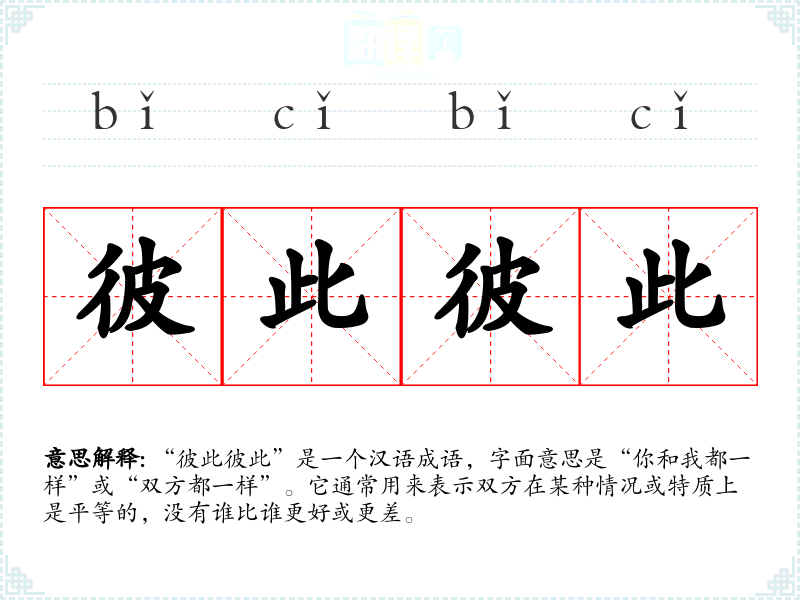 “彼此彼此”是一个汉语成语,字面意思是“你和我都一样”或“双方都一样”。它通常用来表示双方在某种情况或特质上是平等的,没有谁比谁更好或更差。