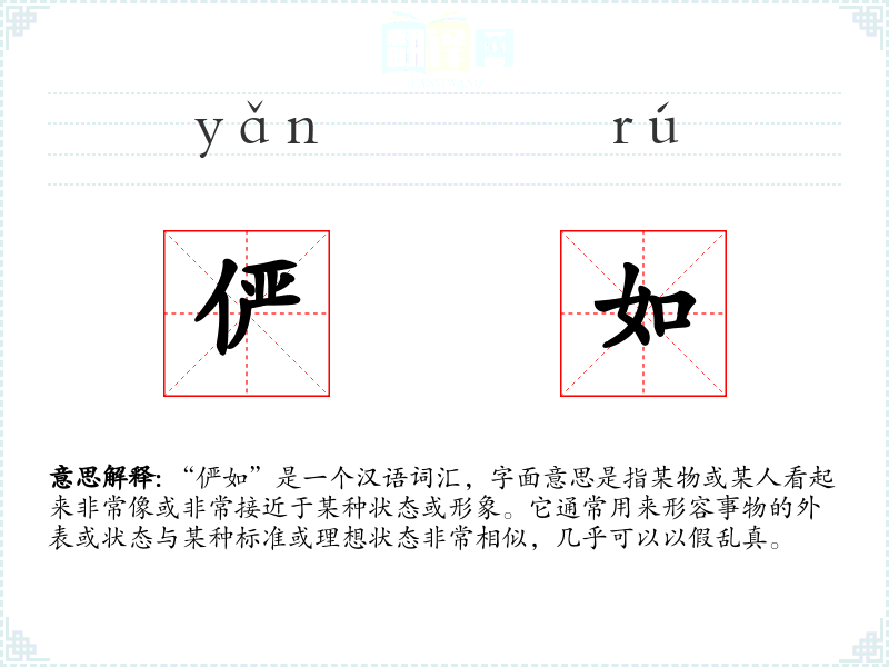 “俨如”是一个汉语词汇,字面意思是指某物或某人看起来非常像或非常接近于某种状态或形象。它通常用来形容事物的外表或状态与某种标准或理想状态非常相似,几乎可以以假乱真。