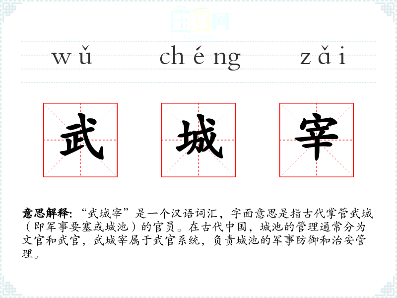 “武城宰”是一个汉语词汇,字面意思是指古代掌管武城(即军事要塞或城池)的官员。在古代**,城池的管理通常分为文官和武官,武城宰属于武官系统,负责城池的军事防御和治安管理。