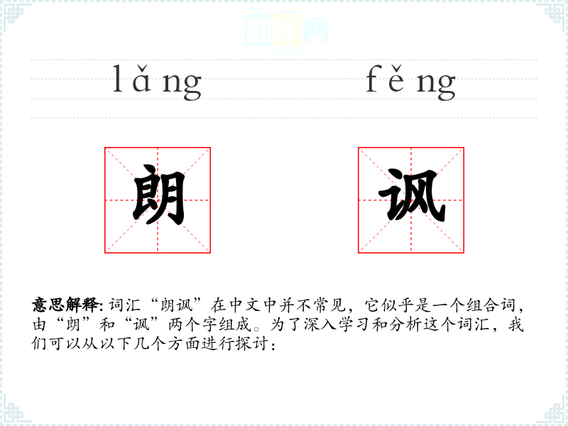 词汇“朗讽”在中文中并不常见,它似乎是一个组合词,由“朗”和“讽”两个字组成。为了深入学习和分析这个词汇,我们可以从以下几个方面进行探讨: