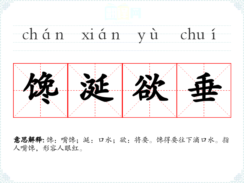 馋:嘴馋;涎:口水;欲:将要。馋得要往下滴口水。指人嘴馋,形容人眼红。