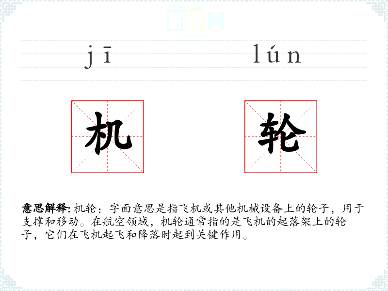 同义词:、轮胎、轮毂 反义词**:无直接反义词,但可以考虑“停机”或“故障”等与机轮功能相反的词汇。