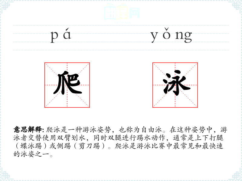 - 反义词:仰泳、蛙泳、蝶泳(这些是其他游泳姿势,与爬泳在动作和方向上有所不同)
