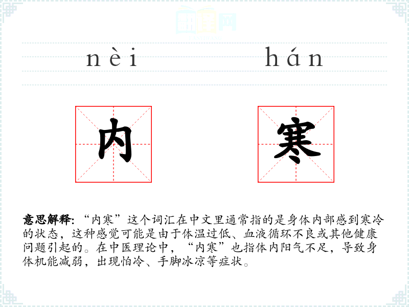 在其他语言中,如英语,可能没有直接对应“内寒”的词汇,但可以用“internal cold”或“chill”来描述类似的感觉。