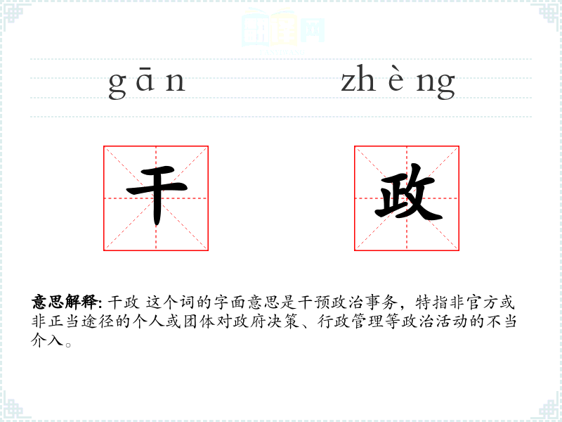 干政 这个词的字面意思是干预政治事务,特指非官方或非正当途径的个人或团体对政府决策、行政管理等政治活动的不当介入。