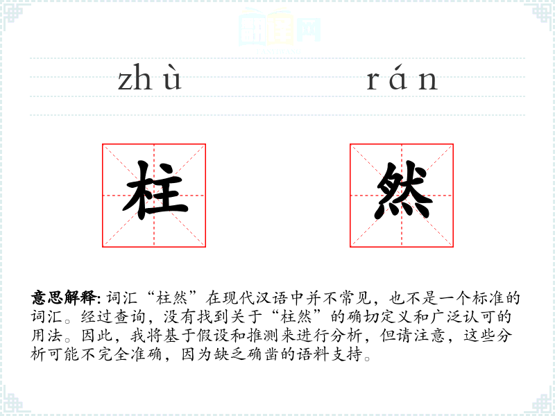 词汇“柱然”在现代汉语中并不常见,也不是一个标准的词汇。经过查询,没有找到关于“柱然”的确切定义和广泛认可的用法。因此,我将基于假设和推测来进行分析,但请注意,这些分析可能不完全准确,因为缺乏确凿的语料支持。