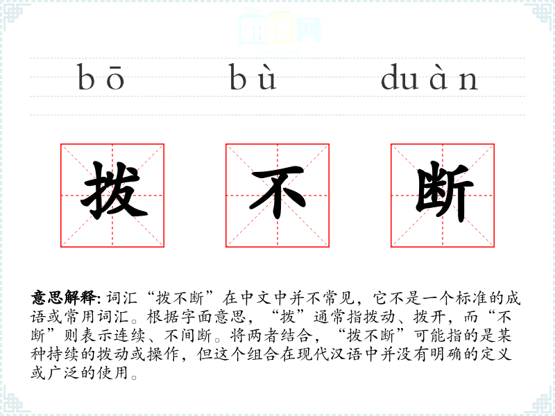 由于“拨不断”不是一个标准词汇,我们无法给出一个确切的基本定义。它可能是某个特定领域或方言中的词汇,或者是某个特定语境下的临时组合。