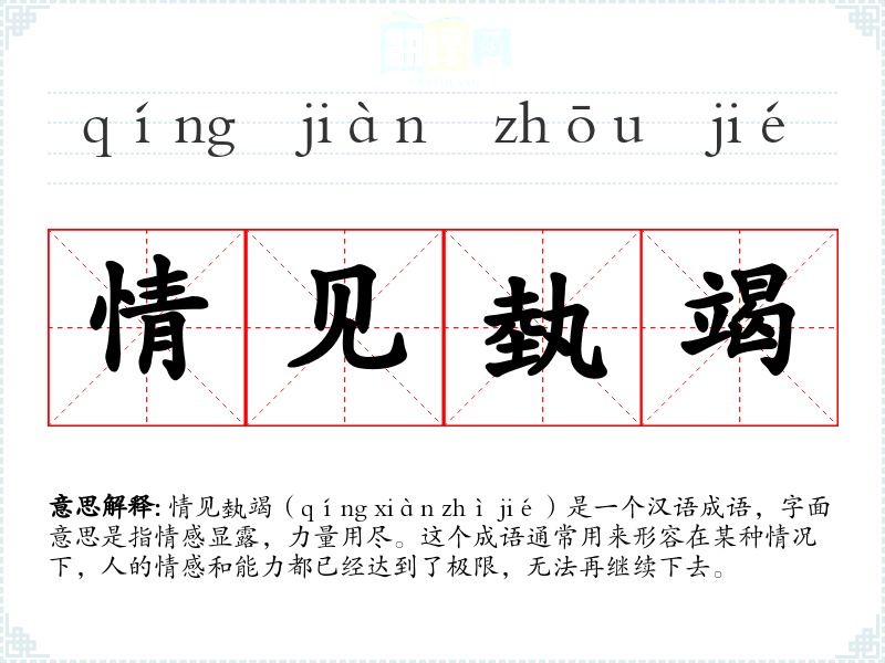 情见埶竭(qíng xiàn zhì jié)是一个汉语成语,字面意思是指情感显露,力量用尽。这个成语通常用来形容在某种情况下,人的情感和能力都已经达到了极限,无法再继续下去。