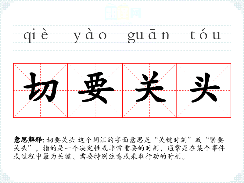 切要关头 这个词汇的字面意思是“关键时刻”或“紧要关头”,指的是一个决定性或非常重要的时刻,通常是在某个**或过程中最为关键、需要特别注意或采取行动的时刻。