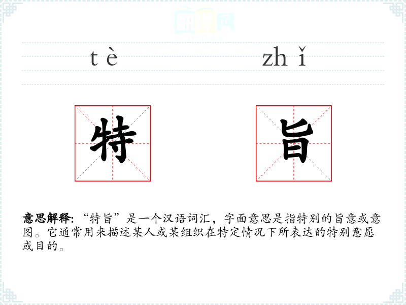 “特旨”由“特”和“旨”两个字组成。“特”表示特别、特殊,“旨”表示意图、目的。在古代文献中,“旨”常用来指代**的命令或意愿,而“特旨”则强调这种命令或意愿的特殊性。
