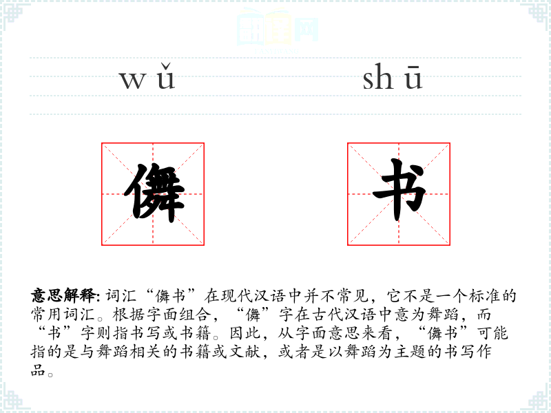 - 词源:“儛”字源自古代汉语,意为舞蹈;“书”字则一直指书写或书籍。