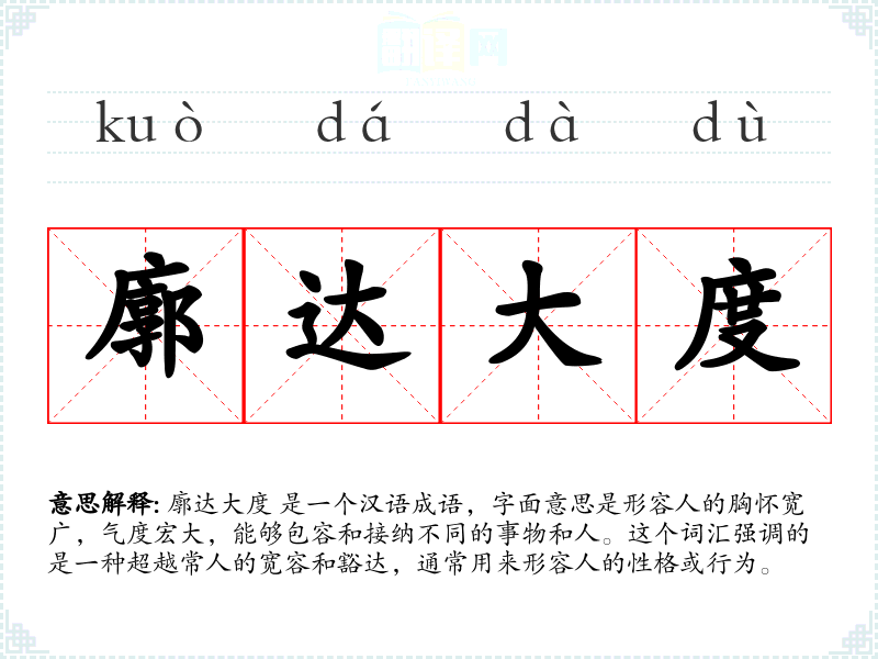 廓达大度 是一个汉语成语,字面意思是形容人的胸怀宽广,气度宏大,能够包容和接纳不同的事物和人。这个词汇强调的是一种超越常人的宽容和豁达,通常用来形容人的性格或行为。