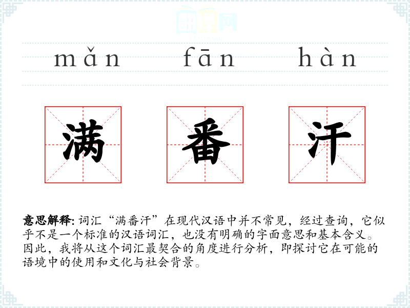 由于“满番汗”不是一个标准词汇,我们无法给出一个确切的基本定义。它可能是某个方言词汇、历史词汇或者是某种特定语境下的用语。