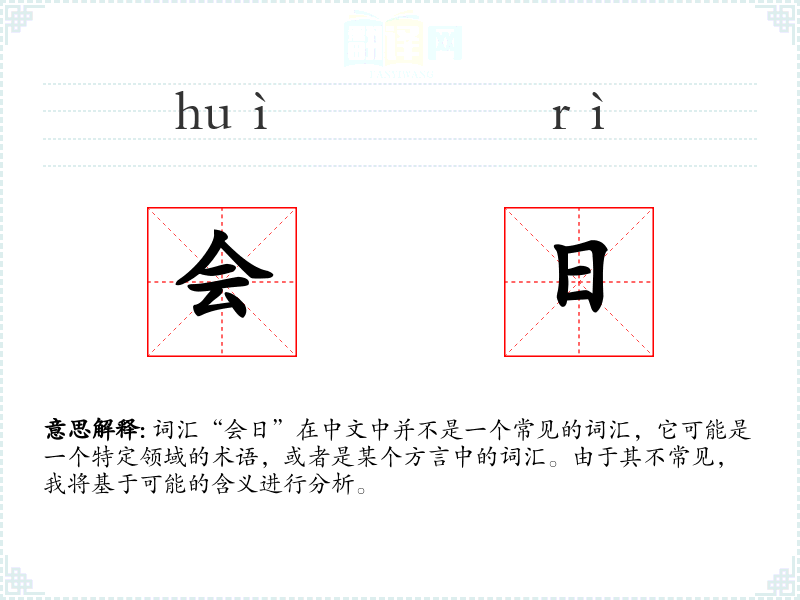 词汇“会日”在中文中并不是一个常见的词汇,它可能是一个特定领域的术语,或者是某个方言中的词汇。由于其不常见,我将基于可能的含义进行分析。