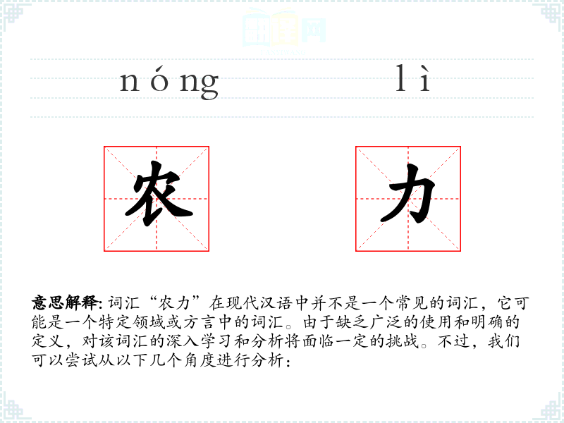 由于“农力”不是一个标准汉语词汇,我们无法给出一个确切的基本定义。它可能是指“农业劳动力”的简称,或者是某个特定地区或社群中对农业劳动者的称呼。
