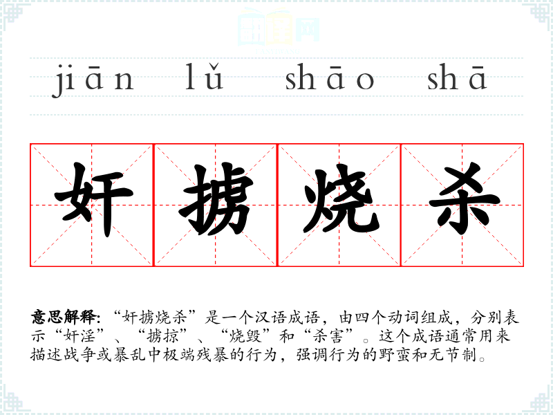 “奸掳烧杀”是一个汉语成语,由四个动词组成,分别表示“奸淫”、“掳掠”、“烧毁”和“杀害”。这个成语通常用来描述战争或暴乱中极端残暴的行为,强调行为的野蛮和无节制。