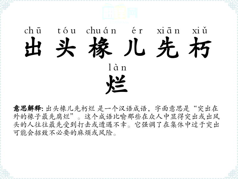 出头椽儿先朽烂 是一个汉语成语,字面意思是“突出在外的椽子最先腐烂”。这个成语比喻那些在众人中显得突出或出风头的人往往最先受到打击或遭遇不幸。它强调了在集体中过于突出可能会招致不必要的麻烦或风险。