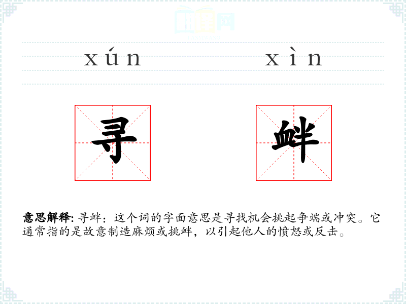 寻衅:这个词的字面意思是寻找机会挑起争端或冲突。它通常指的是故意制造麻烦或挑衅,以引起他人的愤怒或反击。