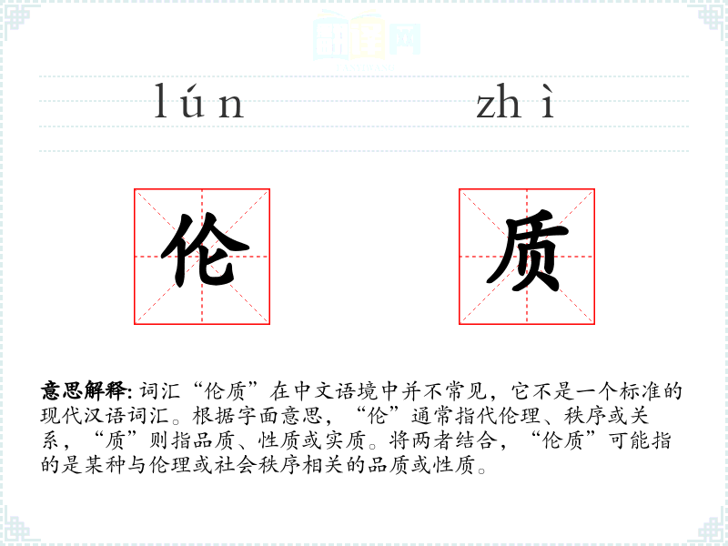 - 字面意思和基本含义:结合“伦”和“质”的含义,“伦质”可能指的是与社会伦理、道德秩序相关的品质或特性。