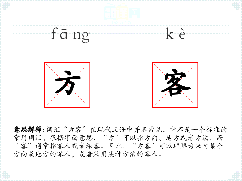 “方客”的字面意思和基本含义是指来自特定方向或地方的客人,或者采用特定方法的客人。