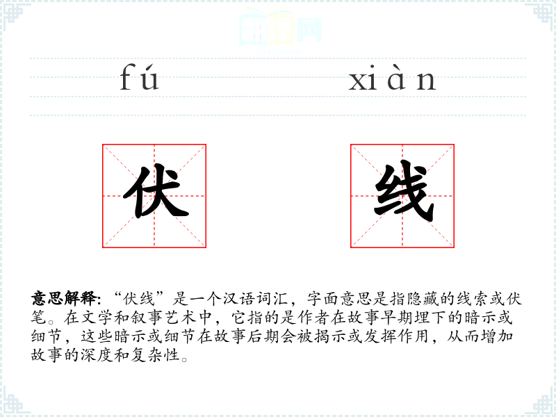 - 同义词:伏笔、暗示、预兆、线索