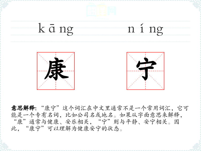 “康宁”这个词汇在中文里通常不是一个常用词汇,它可能是一个专有名词,比如公司名或地名。如果从字面意思来解释,“康”通常与健康、安乐相关,“宁”则与平静、安宁相关。因此,“康宁”可以理解为健康安宁的状态。