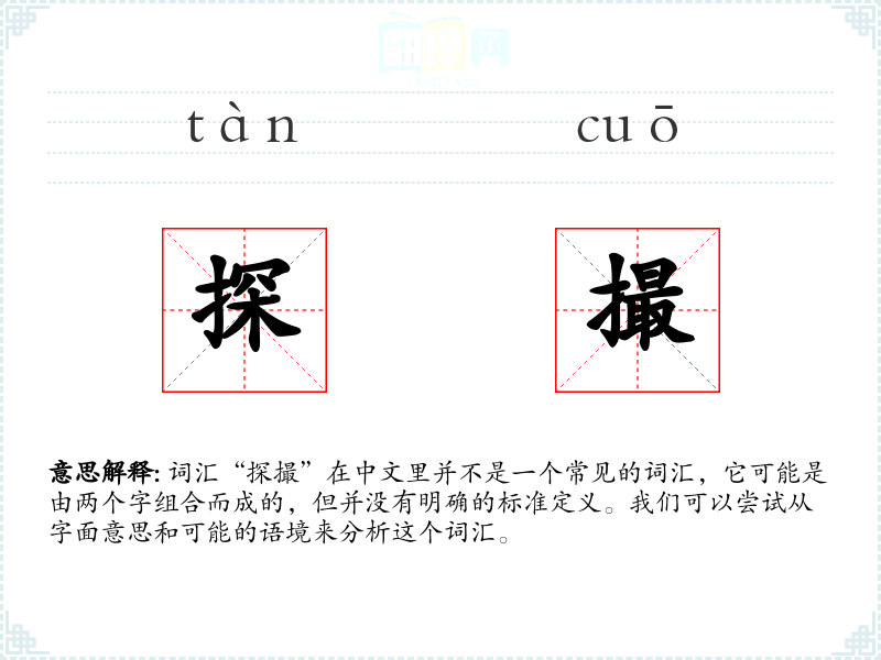 结合这两个字,“探撮”可能指的是探索并记录或撮取信息的行为。