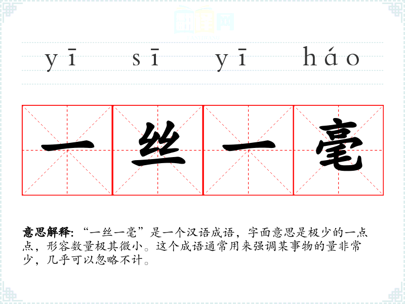 “一丝一毫”是一个汉语成语,字面意思是极少的一点点,形容数量极其微小。这个成语通常用来强调某事物的量非常少,几乎可以忽略不计。