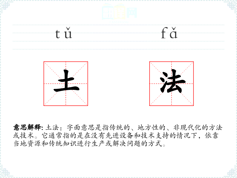 土法:字面意思是指传统的、地方性的、非现代化的方法或技术。它通常指的是在没有先进设备和技术支持的情况下,依靠当地资源和传统知识进行生产或解决问题的方式。