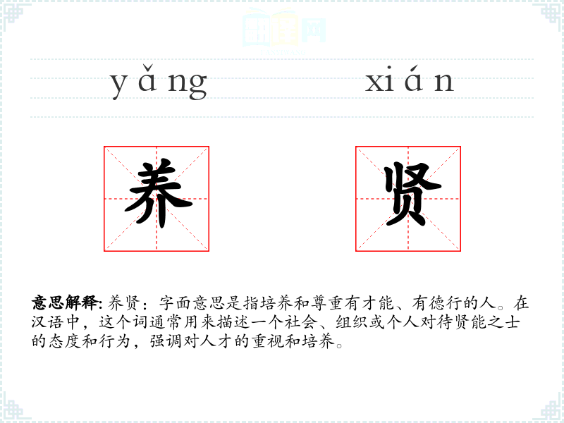 养贤:字面意思是指培养和尊重有才能、有德行的人。在汉语中,这个词通常用来描述一个社会、组织或个人对待贤能之士的态度和行为,强调对人才的重视和培养。