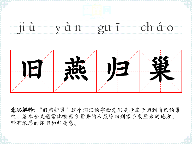 “旧燕归巢”这个词汇的字面意思是老燕子回到自己的巢穴。基本含义通常比喻离乡背井的人最终回到家乡或原来的地方,带有浓厚的怀旧和归属感。