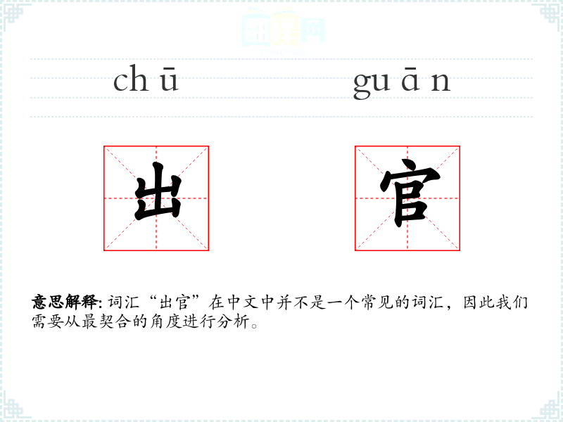 在古代**,官员的地位非常重要,因此与官员相关的词汇往往带有特定的文化和社会背景。但由于“出官”不是一个常用词汇,其具体的文化和社会背景意义不详。
