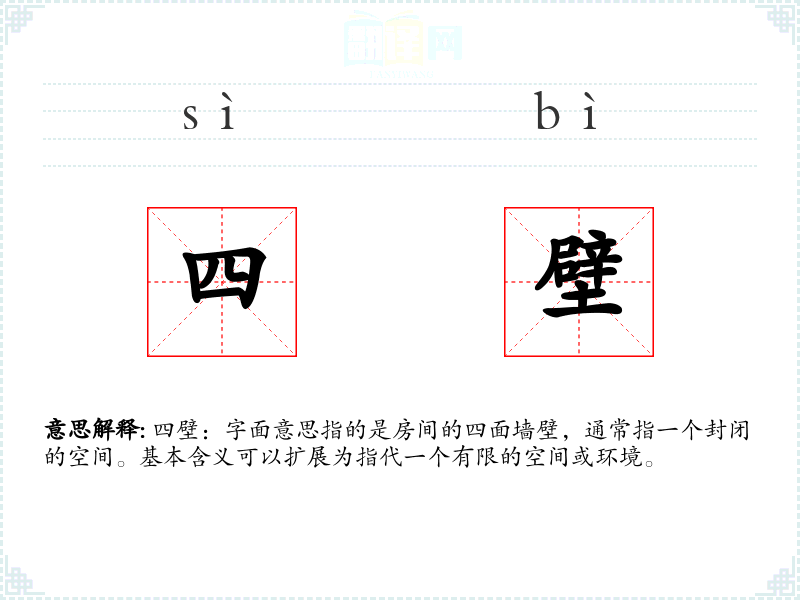 四壁:字面意思指的是房间的四面墙壁,通常指一个封闭的空间。基本含义可以扩展为指代一个有限的空间或环境。