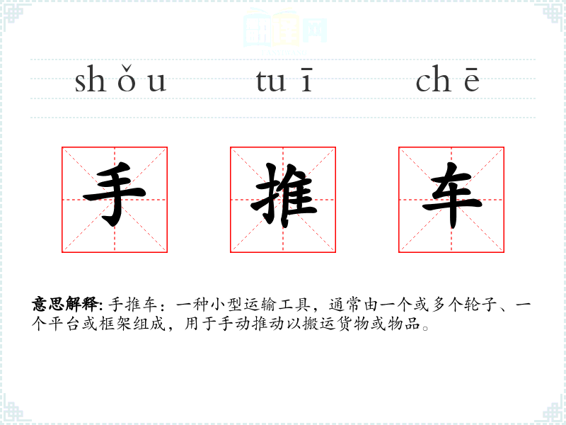 - 反义词:无,因为手推车是一个具体的工具,没有直接的反义词。