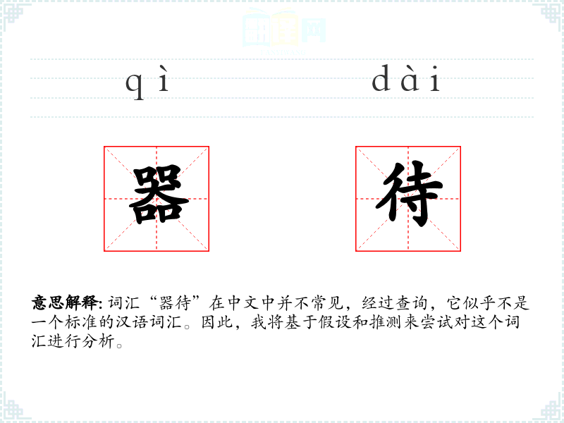 词汇“器待”在中文中并不常见,经过查询,它似乎不是一个标准的汉语词汇。因此,我将基于假设和推测来尝试对这个词汇进行分析。
