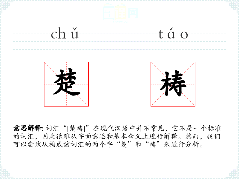 词汇“[楚梼]”在现代汉语中并不常见,它不是一个标准的词汇,因此很难从字面意思和基本含义上进行解释。然而,我们可以尝试从构成该词汇的两个字“楚”和“梼”来进行分析。
