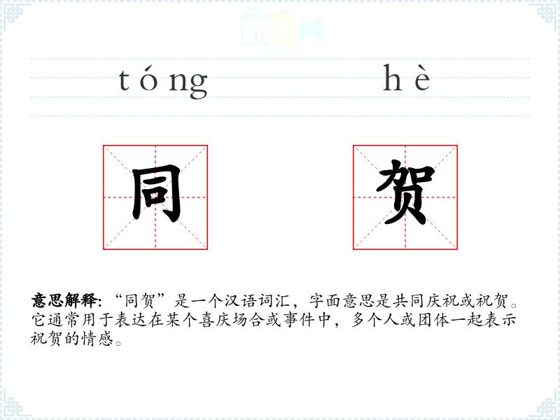 “同贺”由“同”和“贺”两个字组成。“同”意为一起或共同,“贺”意为祝贺。这个词汇在古代文献中已有使用,如《左传》等,随着时间的推移,其使用范围和语境有所扩展,但基本含义保持不变。