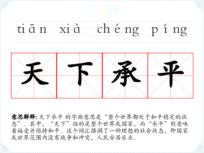 天下承平 的字面意思是“整个世界都处于和平稳定的状态”。其中,“天下”指的是整个世界或国家,而“承平”则意味着接受并维持和平。这个词汇强调了一种理想的社会状态,即国家或世界范围内没有战争和冲突,人民安居乐业。