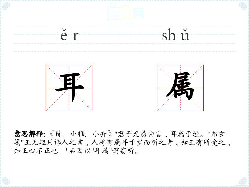 《诗.小雅.小弁》"君子无易由言﹐耳属于垣。"郑玄笺"王无轻用谗人之言﹐人将有属耳于壁而听之者﹐知王有所受之﹐知王心不正也。"后因以"耳属"谓窃听。