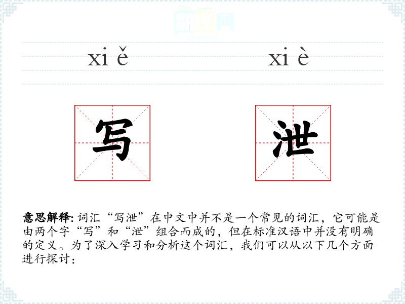由于“写泄”不是一个标准词汇,我们无法给出确切的基本定义。但从字面上理解,“写”通常指书写或表达,而“泄”则可能指泄露或释放。因此,“写泄”可能指的是通过书写来释放或表达内心的情感或秘密。